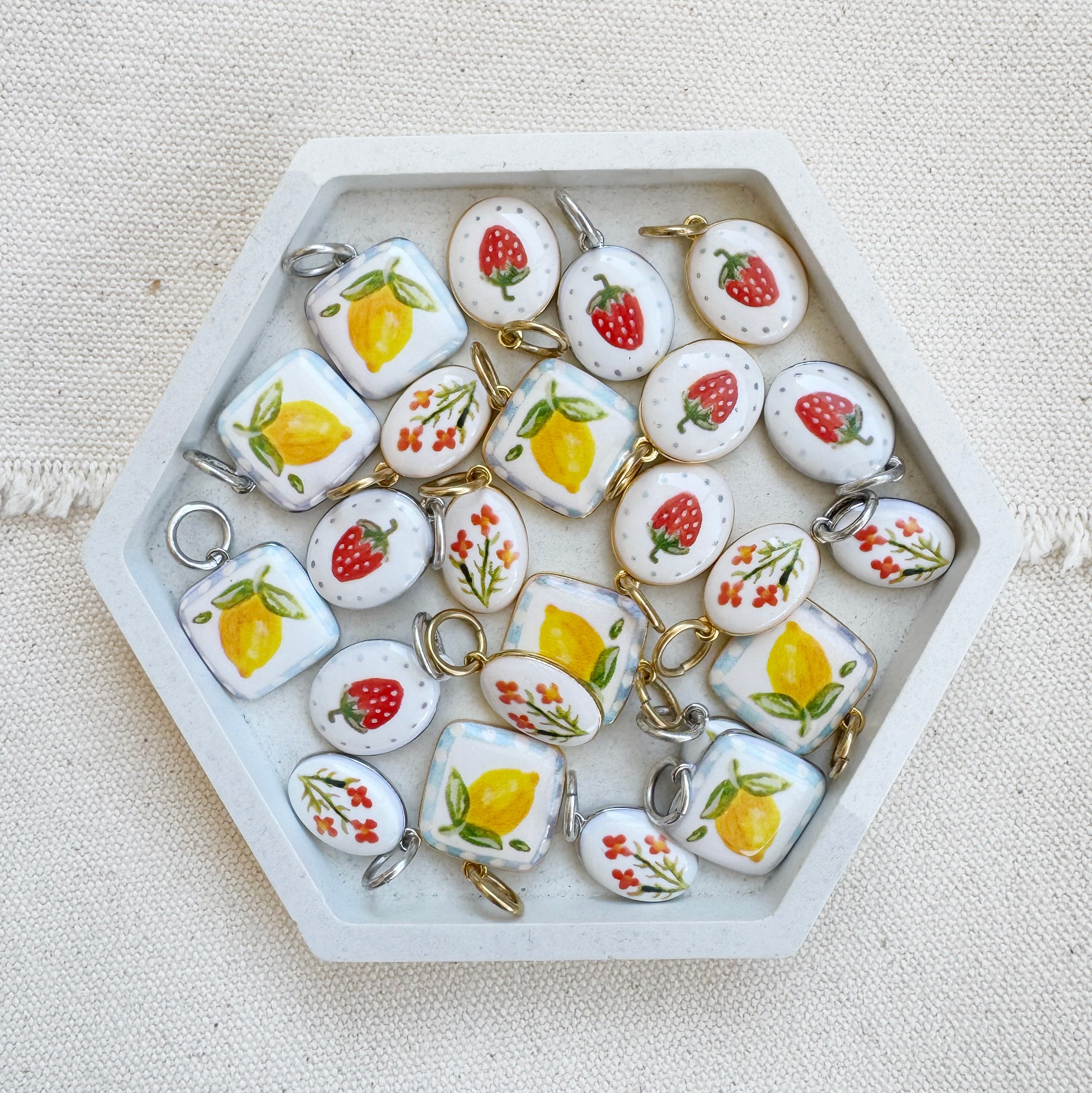 Sweet painted ceramic charms are ready to add to chains or bangles. Charms are made of stainless steel, plated with anti-tarnish gold or silver. A concrete hexagon dish holds 24 charms, in Silver and Gold.